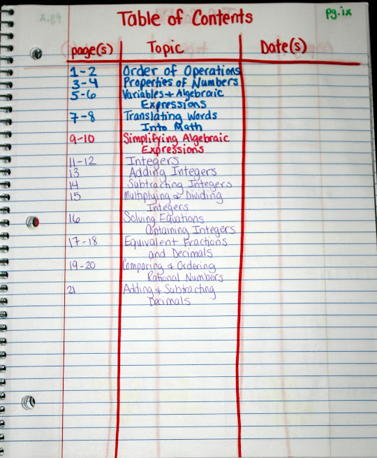 - Table of Contents - one of the major benefits of using an interactive notebook is that it helps keep your students more organized. Every page in the notebook is numbered, so the table of contents makes it easy to quickly locate specific topics. (I also decided to color-code my Table of Contents by unit. Of course, I decided this after I already started so my first entries in the Table of Contents are random colors.)