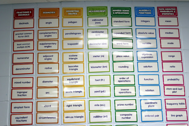 My PDP (Professional Development Plan) requires that I have a Math Word Wall. When this requirement first came about, I made a word wall using sentence strips. It took a long time to create and when I sent them to my Processing Center to get laminated, only about 75% of the words made it back to me. I was mad!